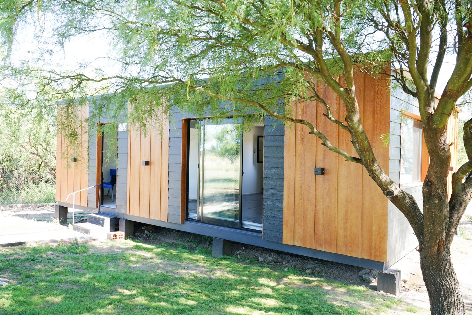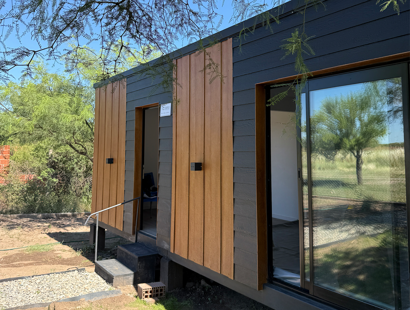 Esta unidad modular, destinada a funcionar como gimnasio de artes marciales, se monta sobre pilotes de hormigón que aseguran estabilidad y una correcta nivelación del terreno. Su envolvente exterior está completamente resuelta en siding, combinando piezas horizontales en color negro con paneles verticales en tono natural, lo que genera un contraste ordenado y contemporáneo. Las aberturas amplias favorecen la iluminación del interior y acompañan la estética limpia del conjunto. El sistema modular permite un montaje rápido y preciso, adaptándose con eficiencia al entorno natural donde se implanta.
