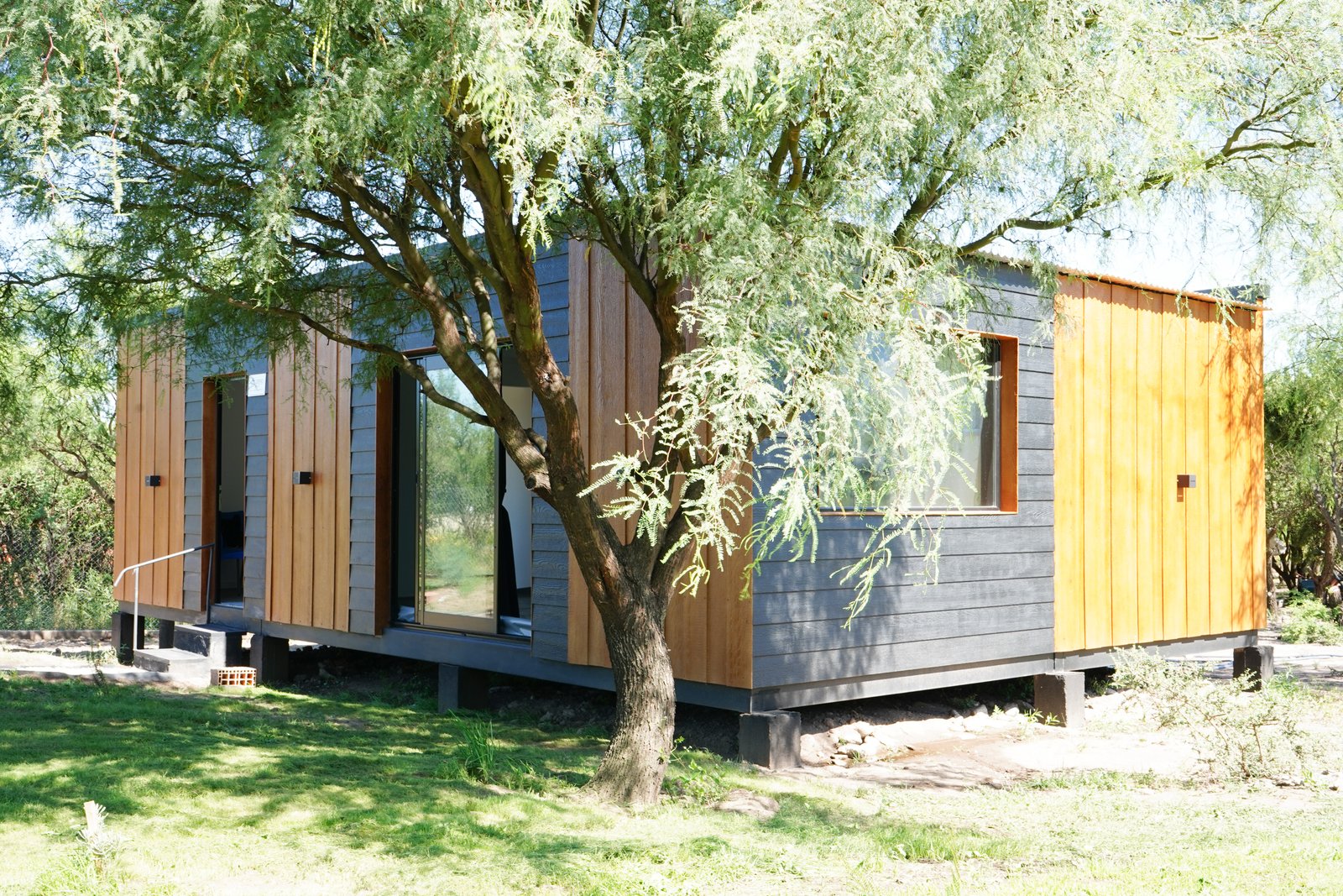 Esta unidad modular, destinada a funcionar como gimnasio de artes marciales, se monta sobre pilotes de hormigón que aseguran estabilidad y una correcta nivelación del terreno. Su envolvente exterior está completamente resuelta en siding, combinando piezas horizontales en color negro con paneles verticales en tono natural, lo que genera un contraste ordenado y contemporáneo. Las aberturas amplias favorecen la iluminación del interior y acompañan la estética limpia del conjunto. El sistema modular permite un montaje rápido y preciso, adaptándose con eficiencia al entorno natural donde se implanta.